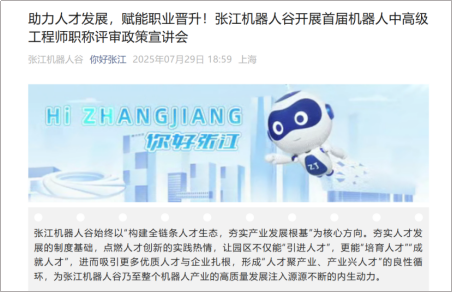 7月31日,为使本市各申报人员更清楚了解职称评审要求,米兰·(milan)中国机器人有限公司官网联合张江机器人谷成功举办上海市首届工程系列数字技术专业职称申报政策宣讲会。会议通过申报范围、评审流程、材料准备、政策亮点等方面的深度解读,为机器人、智能制造等产业前沿领域专业技术人才提供权威申报指导。