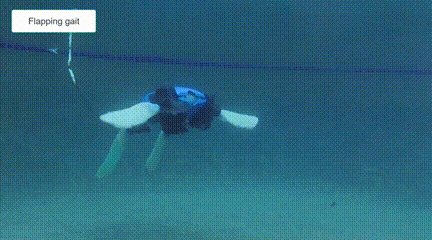 这些变化使机器龟的肢体能够在有利于行走的圆柱形几何形状,和有利于游泳的平鳍几何形状之间来回切换,进行适应性变形。在真正下水测试时,机器龟通过行走和匍匐前进的方式靠近水面,到达水域后,机器龟就将腿变成鳍状肢,使其能够以基于升力和阻力的水上步态进行畅游。