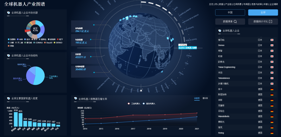 机器人产业图谱是机器人产业大数据平台,覆盖机器人产业核心数据、机器人产业链、应用场景、机器人科普、平台技术布局及相关产业政策等七大板块,汇聚机器人产业海量数据信息。可直观便捷地呈现机器人产业相关数据,全面展示机器人上中下游产业集聚情况,准确反映出机器人产业的发展现状、地理分布和技术动态。
