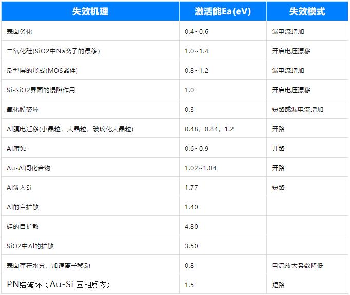 那么问题来了,很多人不知道活化能Ea应该选取那个值?其实不同的Ea对应了不同的失效机理,下面表格是一些电子元器件在经验累积得到推荐值。
