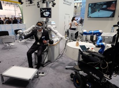 德国宇航中心(Deutsches Zentrum für Luft- und Raumfahrt,简称DLR)展出一款名为HUG(haptic user interface for telemanipulating)的双臂操作系统。 研究人员展示了使用这一系统控制edan进行日常作业。作业内容包括:开冰箱、倒水、玩积木等。这一系统能够很好的解决远程机器人控制问题,例如:太空站中的机器人。